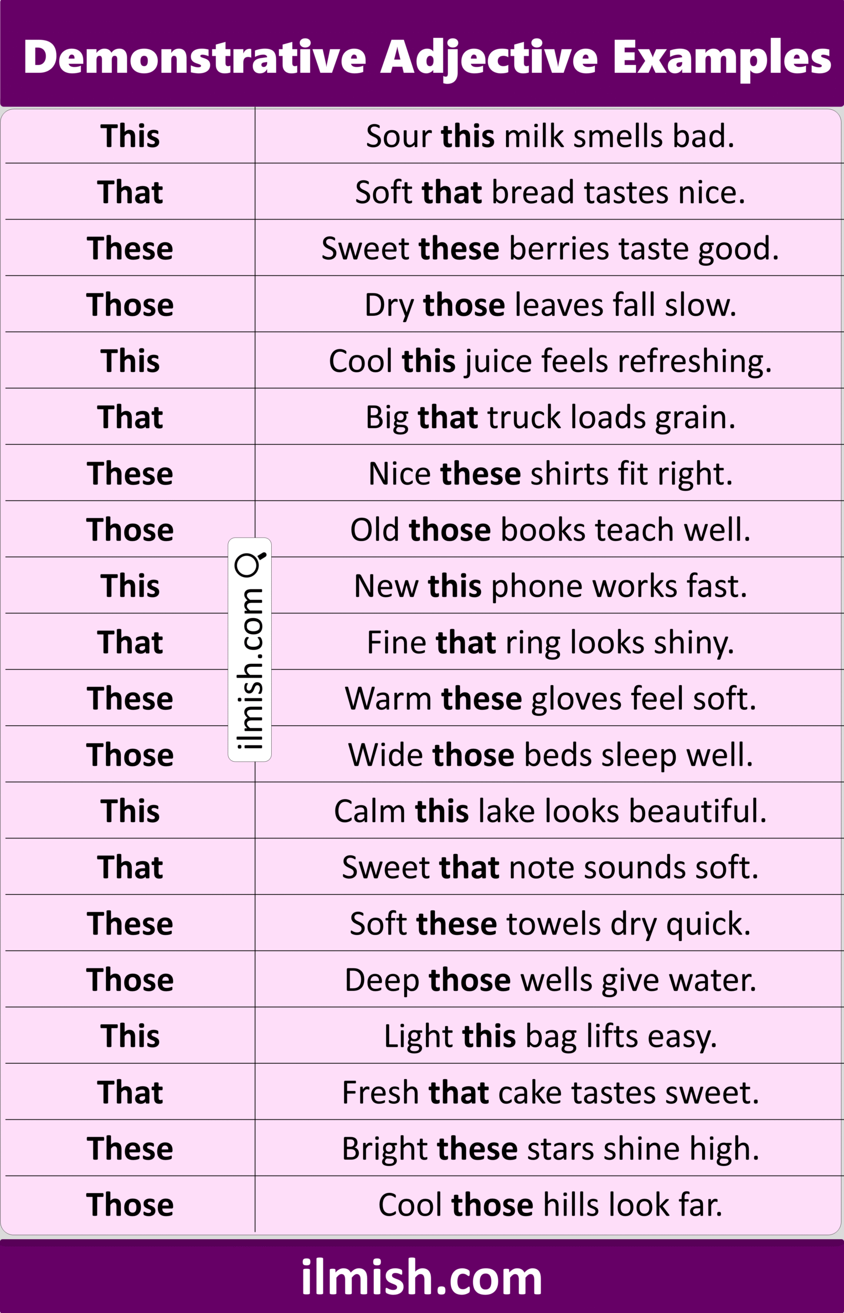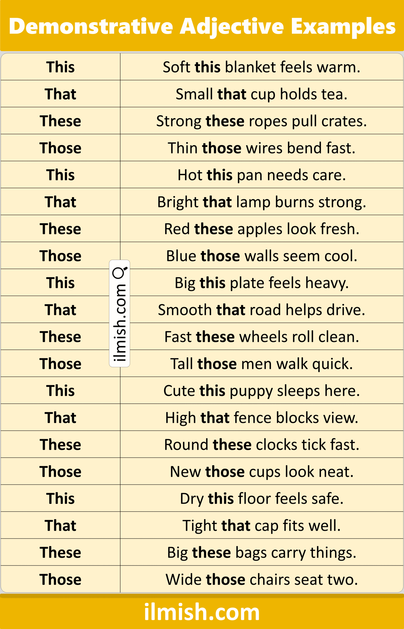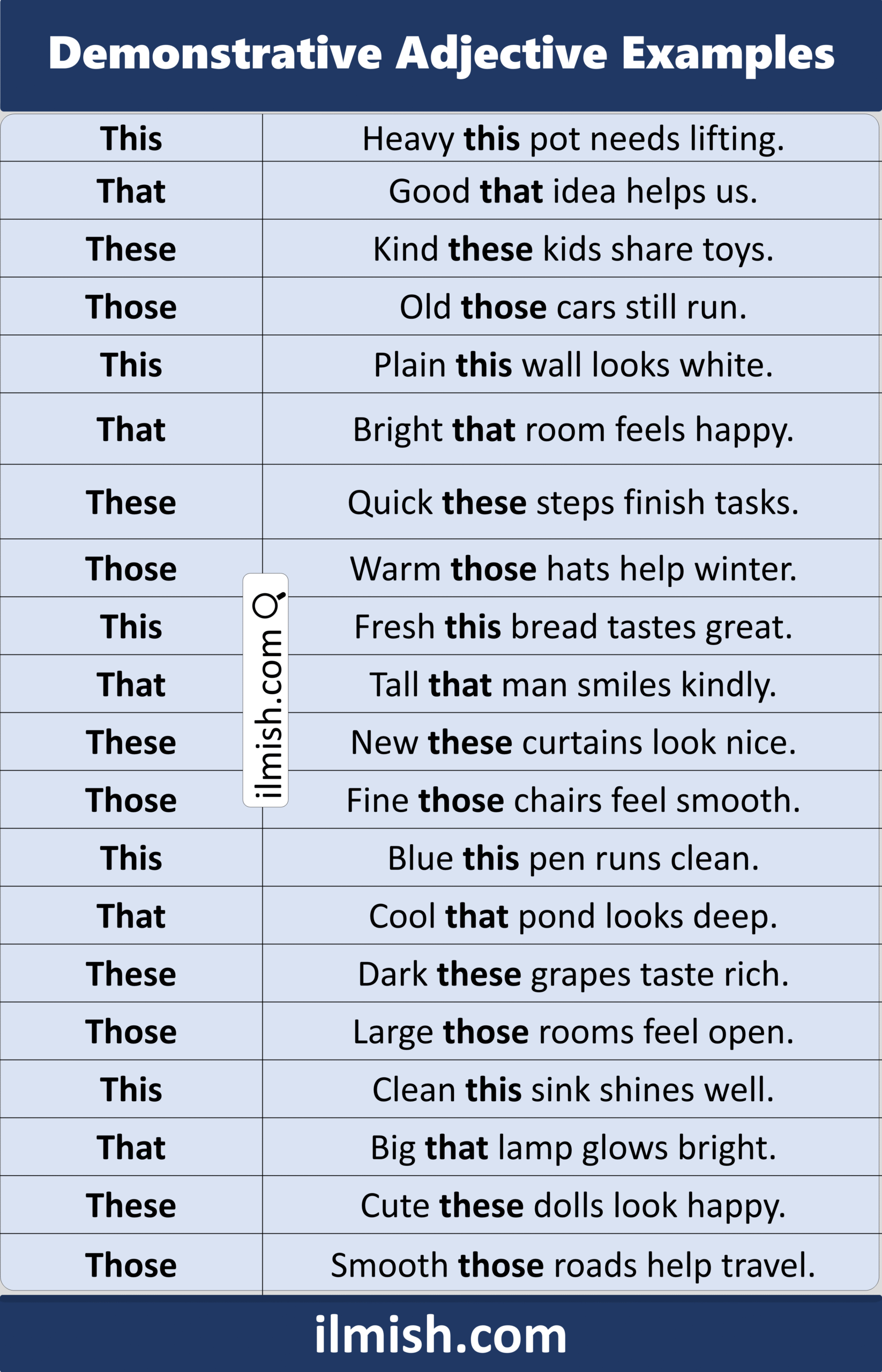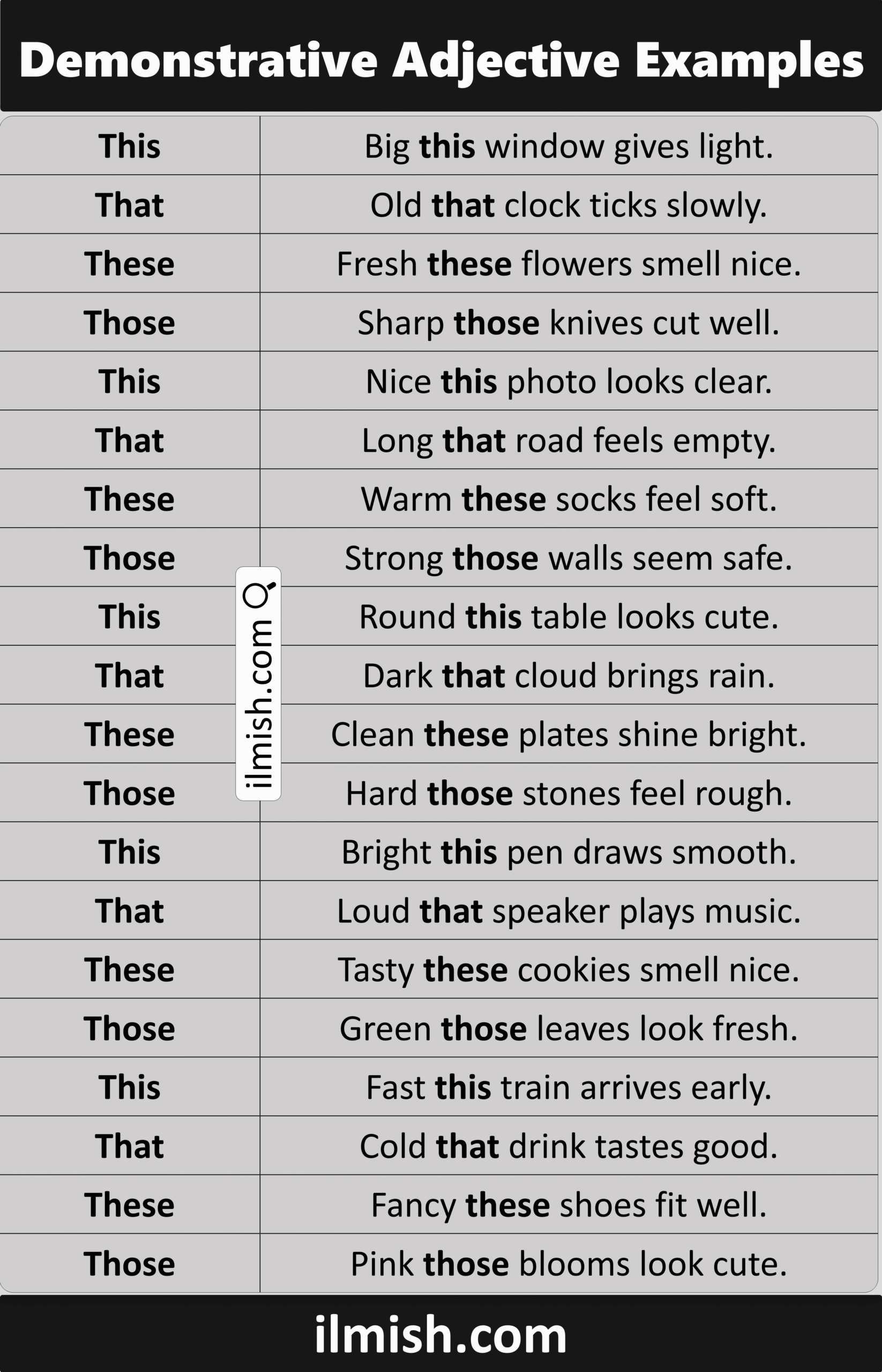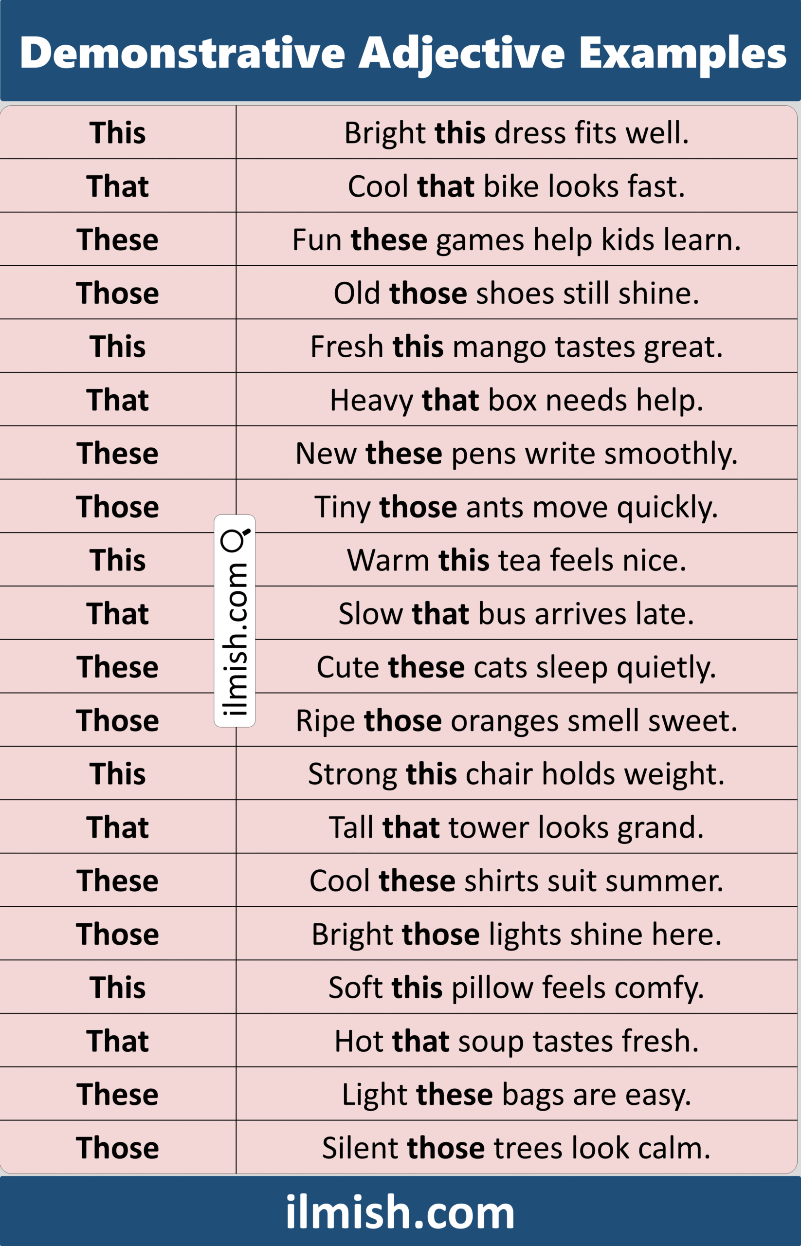 Demonstrative adjectives are helpful words we use to point out specific people, places, or things. They make our sentences clear by showing which item we are talking about. Words like this, that, these, and those tell us whether something is near or far, or whether we are talking about one thing or many. We use them every day without even noticing—while choosing food, talking about objects around us, or sharing stories. In this article, you will learn 100 Example Sentences of Demonstrative Adjectives work in real life. Read them carefully and notice how they make communication simple and more interesting.