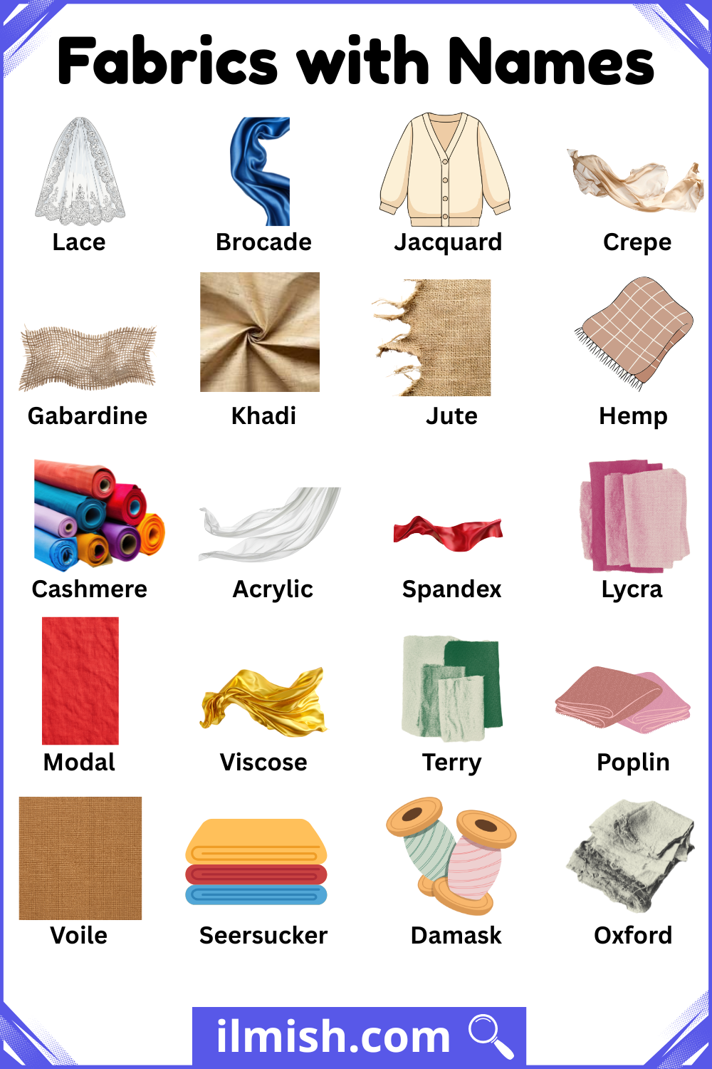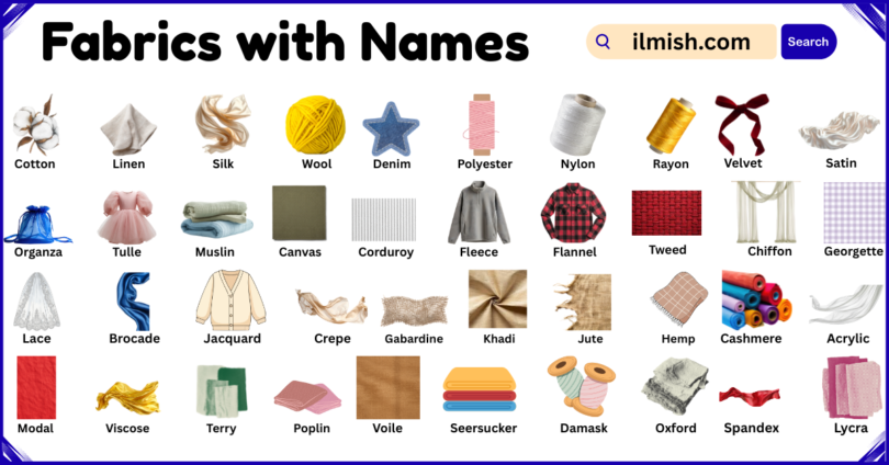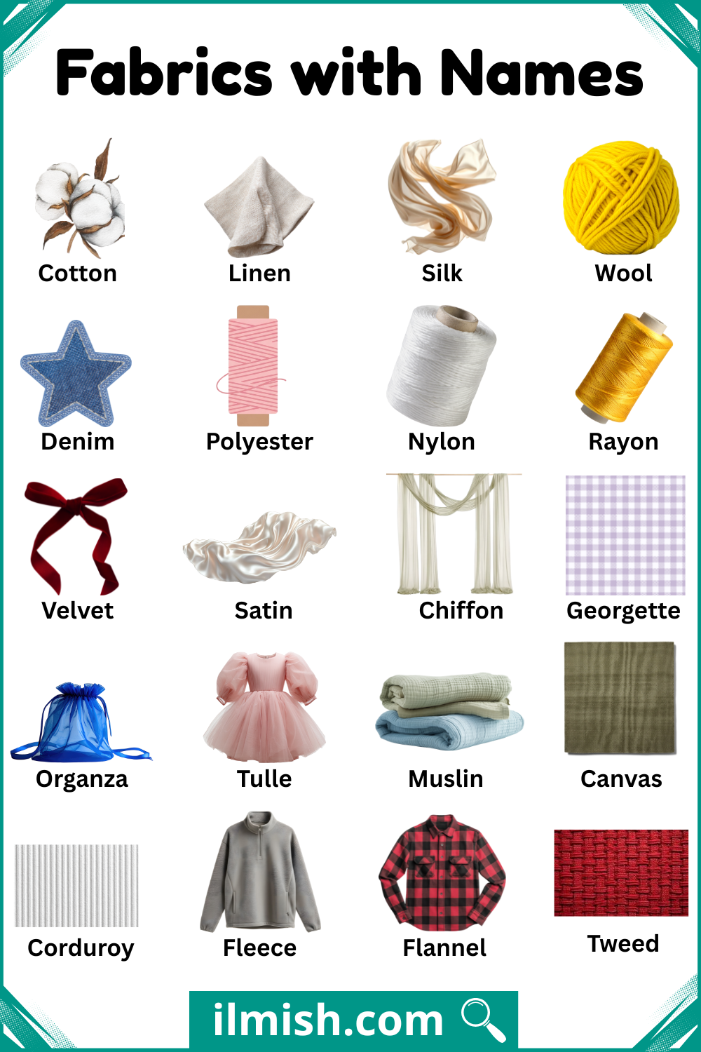 Fabrics are materials used to make clothes, home items, and many everyday products. They come in different types, textures, and qualities, depending on how they are made and what fibers are used. Learning the names and types of fabrics in English helps students understand clothing, fashion, and textile topics more clearly. In this article, you will learn a list of fabrics with their English names, types, and clear pictures. These visuals make it easier to identify each fabric and understand where and how it is commonly used, making learning simple and practical for all readers.