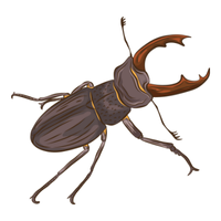 Large beetle with prominent antler-like mandibles, mostly males, feeds on tree sap and decaying fruits at night.
