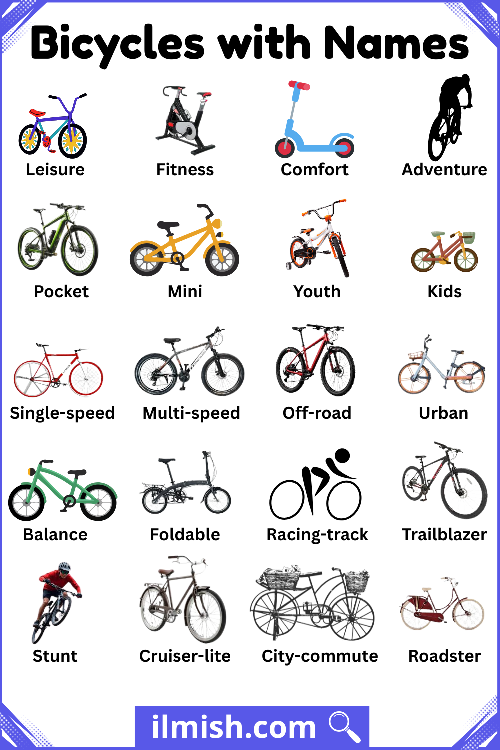 Bicycles are one of the most popular and eco-friendly modes of transportation in the world. They come in many different types, each designed for a specific purpose, such as racing, mountain riding, commuting, or leisure. Some bicycles are built for speed, while others are made for comfort or rough terrains. In this blog post, you will learn a clear and simple list of bicycles with their names and types in English, along with pictures to help you easily identify them. This guide is written in easy language, making it useful for beginners, students, cycling enthusiasts, and anyone interested in learning more about the different kinds of bicycles.