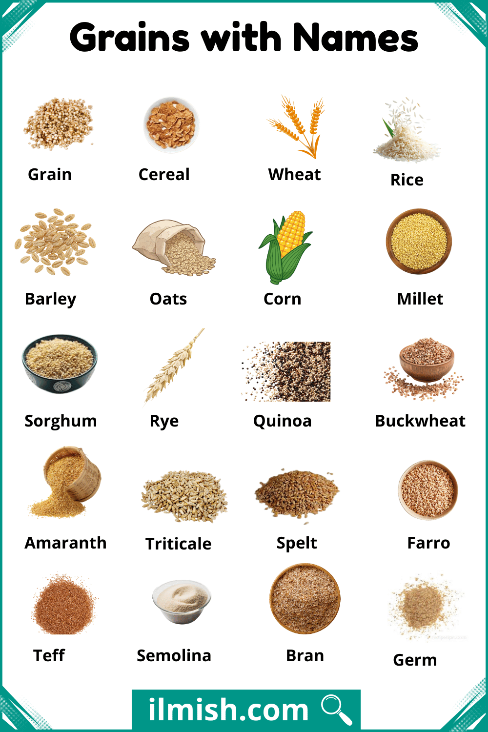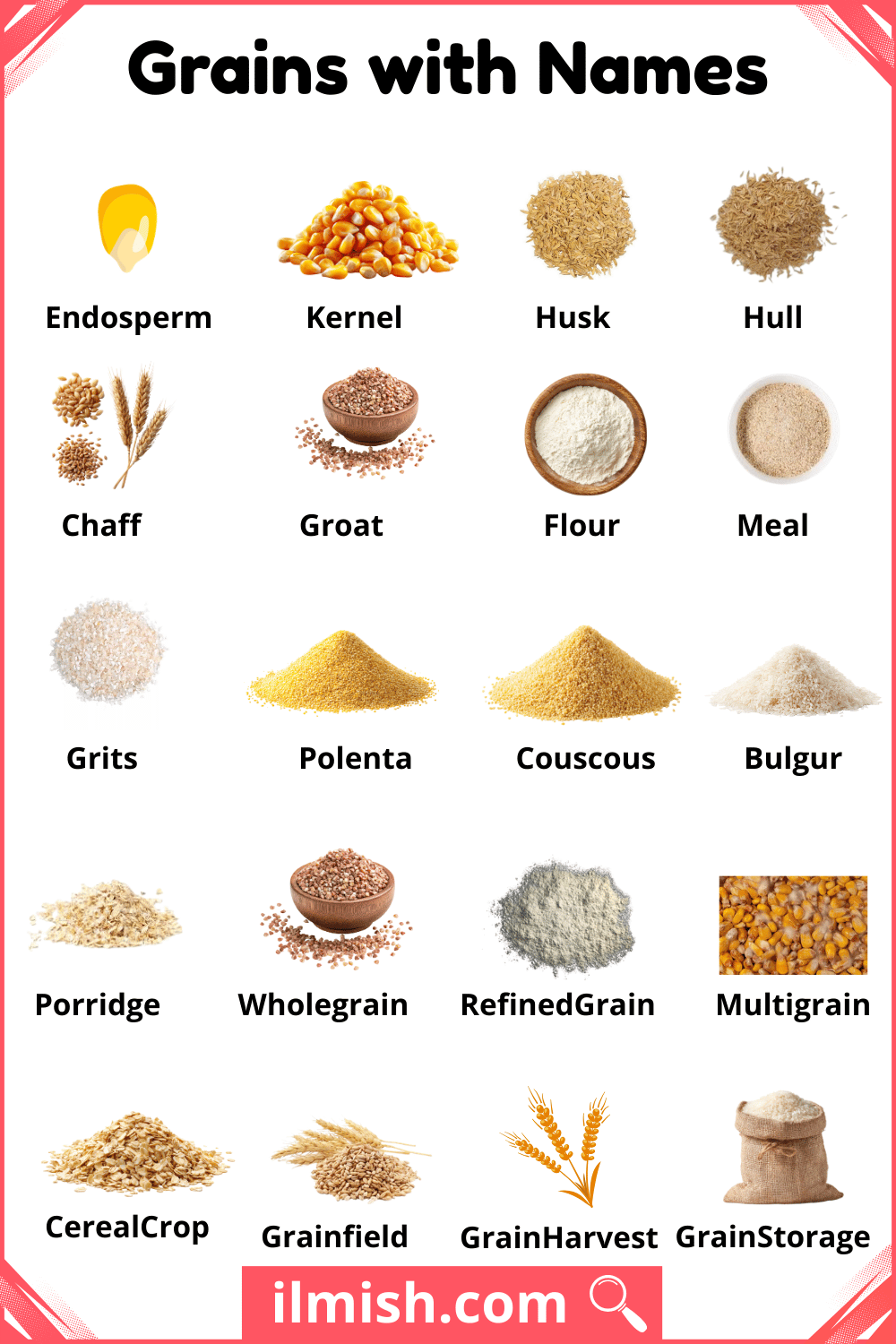 Grains are one of the most important food sources in the world. They are used to make bread, rice dishes, pasta, porridge, and many other daily meals. Grains grow in fields and are harvested from different cereal plants. Some grains are eaten whole, while others are processed into flour and other products. Each type of grain has its own taste, texture, and health benefits. In this article, you will learn a List of Grains with Names and Types in English with Pictures to help you easily recognize them. This guide is simple, useful, and perfect for students who want to improve their food vocabulary and general knowledge.