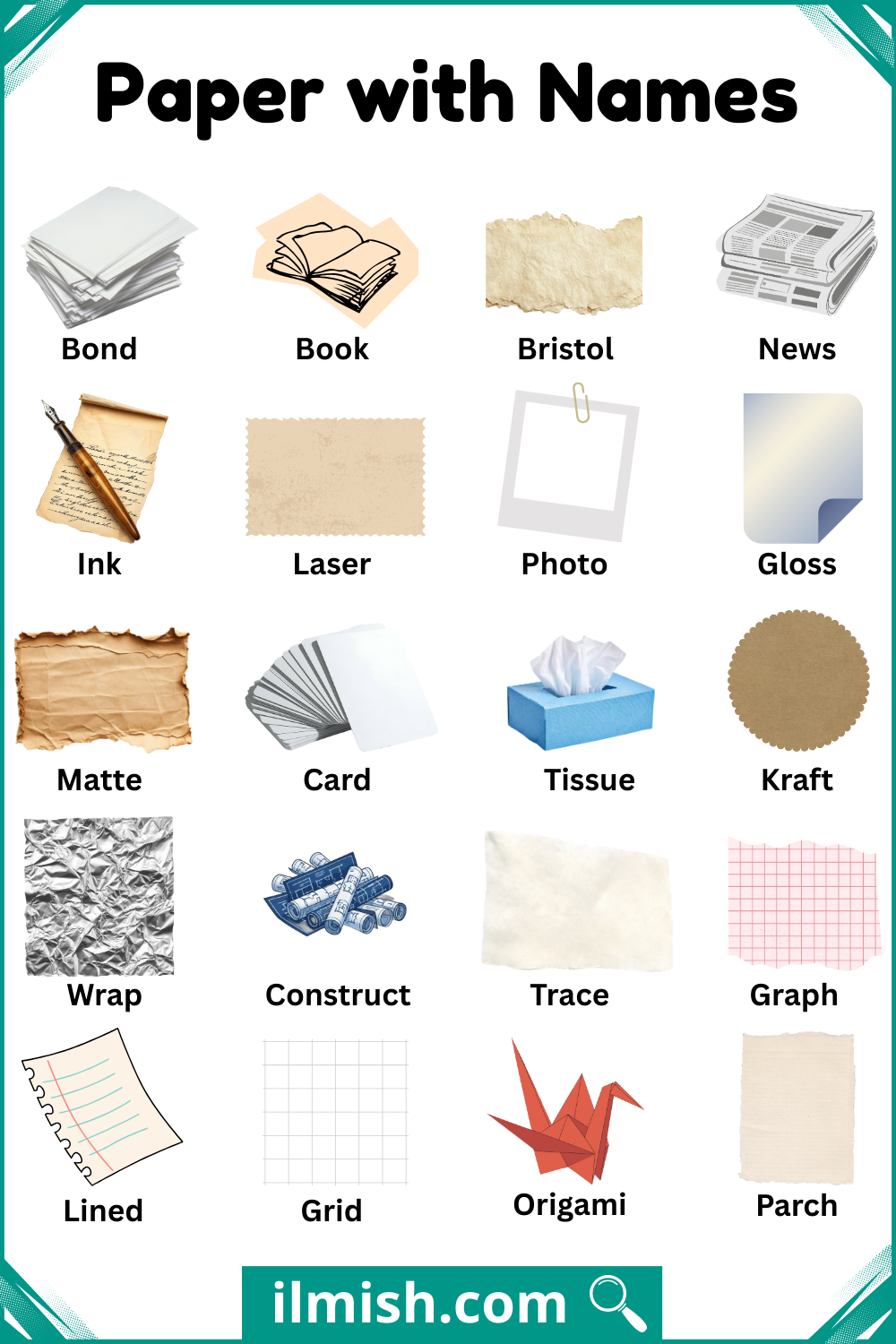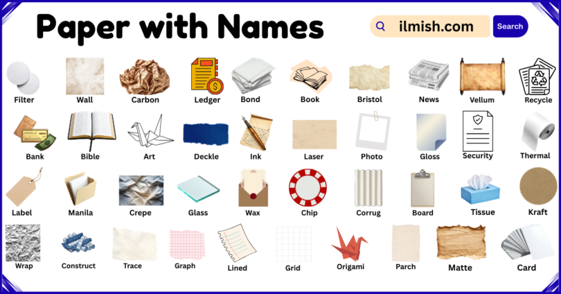 Paper is one of the most common and versatile materials used in our daily lives for writing, printing, packaging, and art. It comes in many types, each designed for a specific purpose, such as smooth paper for printing, thick paper for crafting, or textured paper for artwork. Understanding the different names and types of paper helps students, artists, and professionals choose the right paper for their needs. In this article, you will learn a clear and easy list of paper with names and types in English, along with pictures to help you recognize them. This guide is written in simple language, making it easy for beginners and anyone interested in learning about paper to understand.