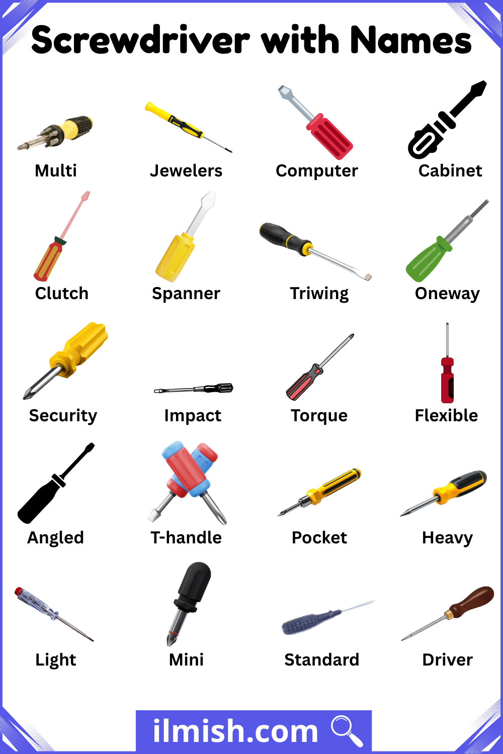 Different Type of screwdrivers with Name and Picture