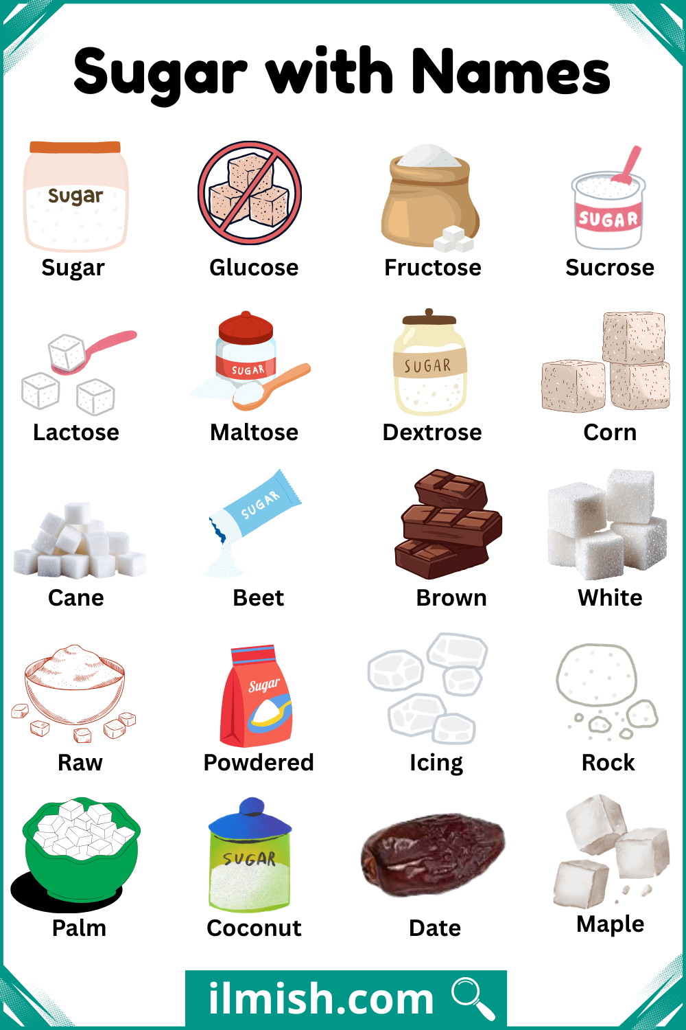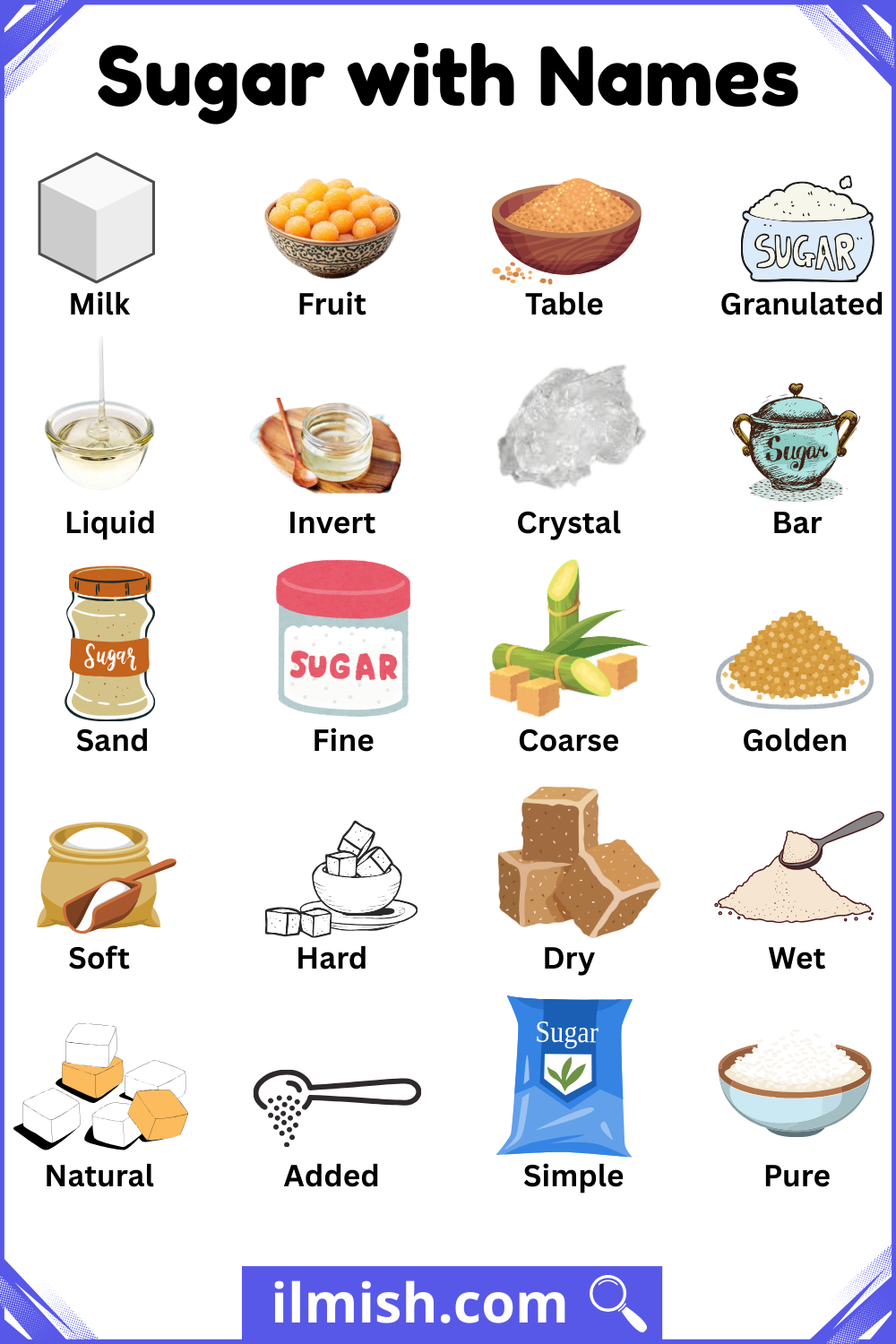 Sugar is a common ingredient used in many foods and drinks around the world. It comes in different forms and types, each with its own source, taste, and use in cooking and baking. Learning the names and types of sugar in English helps students and beginners understand food labels, recipes, and everyday conversations related to food. In this article, you will learn different types of sugar with names in English and clear pictures. These visuals make it easier to recognize each type and understand how it is commonly used in daily life and kitchens.