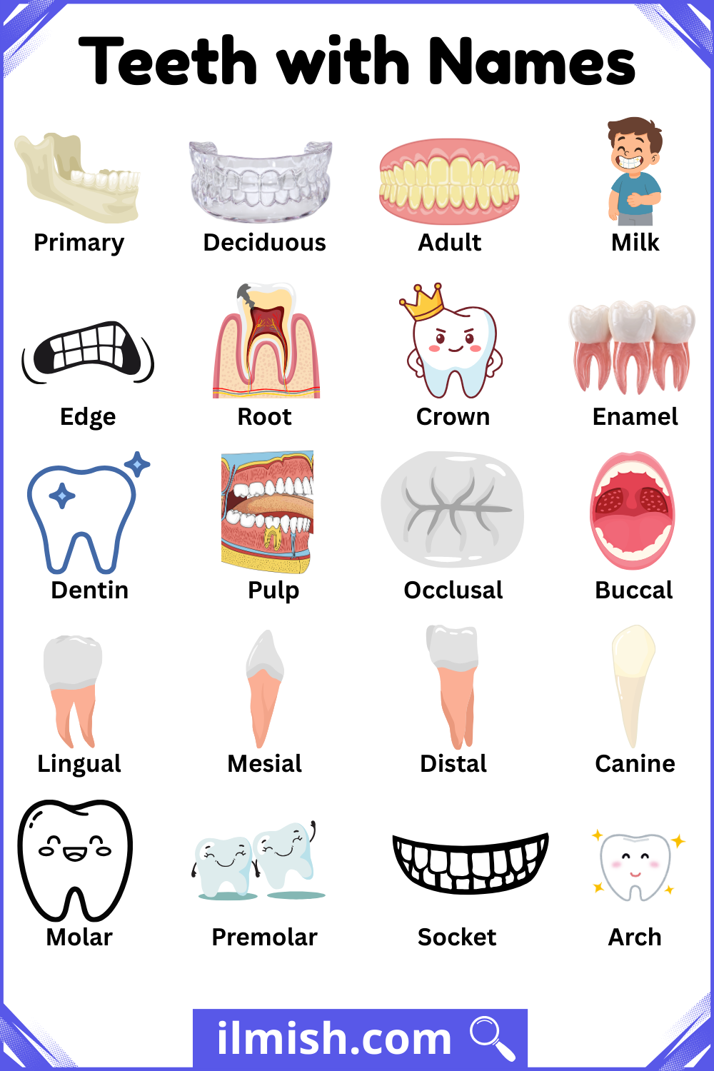 Teeth are important parts of our mouth that help us eat, speak, and maintain a healthy smile. There are different types of teeth, each with a special job: some are for biting, some for tearing, and others for grinding food. Understanding the names and types of teeth helps us learn how our mouth works and how to take care of it properly. In this article, you will learn a clear list of teeth with their names and types in English, along with pictures to help you recognize them easily. This guide is written in simple language, making it easy for students, parents, and anyone interested in dental health to understand.