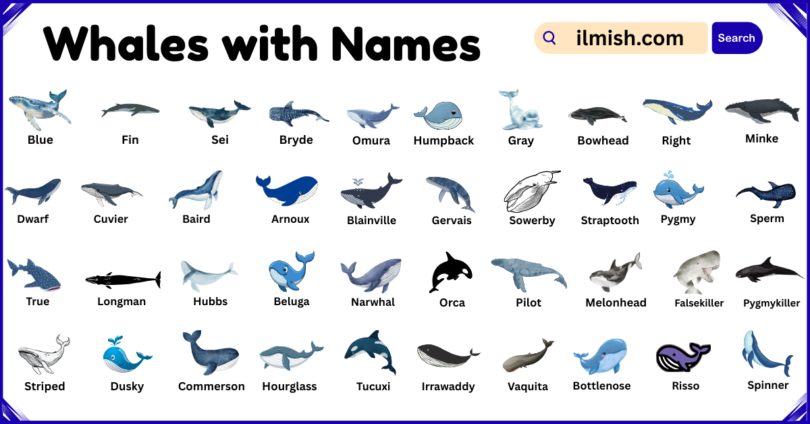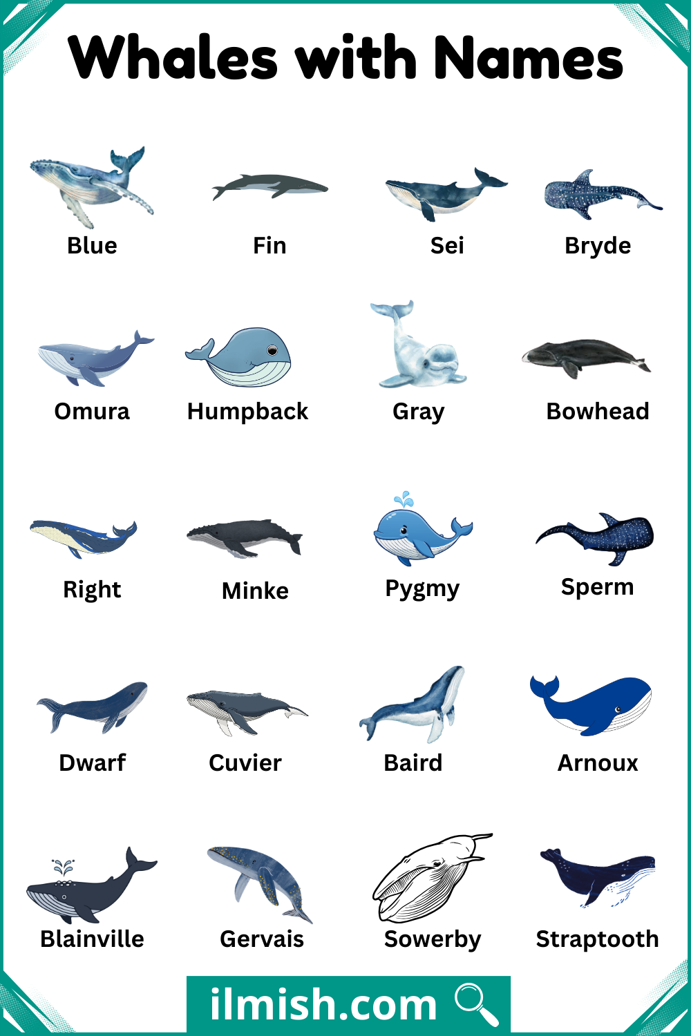 Whales are the gentle giants of the ocean, known for their massive size, intelligence, and peaceful nature. They live in seas around the world and come in many different types, each with its own shape, color, and behavior. In this article, you will learn a clear list of whales with their names and types in English, along with pictures, so you can easily recognize and learn about each one. This simple guide is perfect for students, teachers, and anyone who wants to understand these amazing sea animals in easy English.