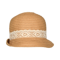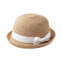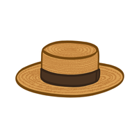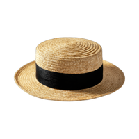 Stiff straw hat with flat top and ribbon, classic summer style, often used for boating or parties.