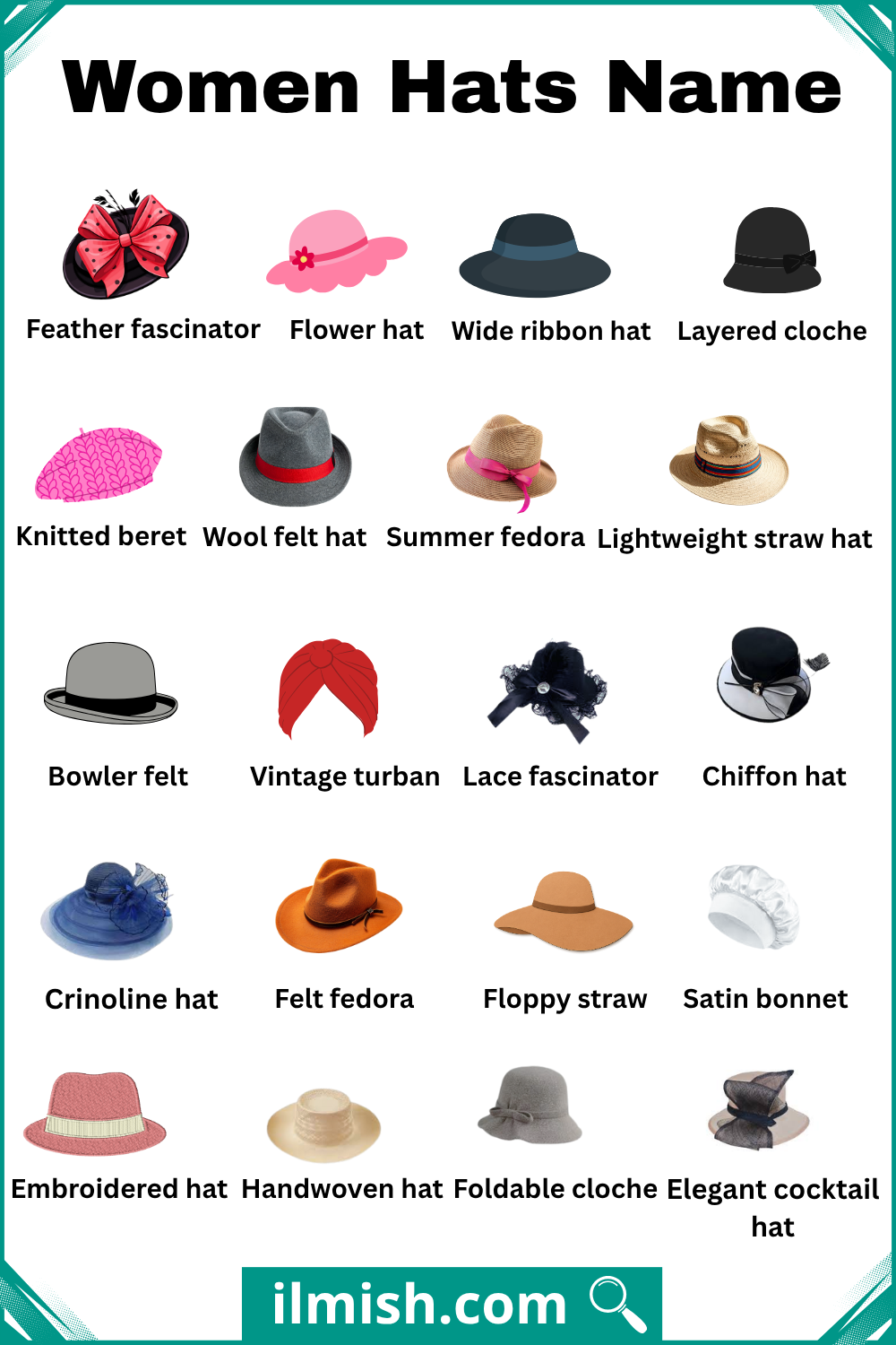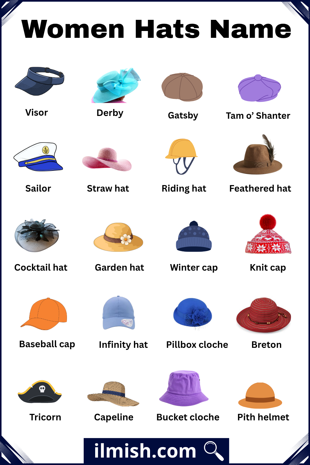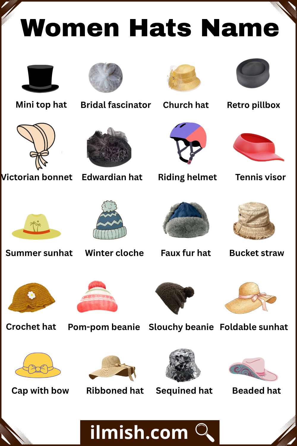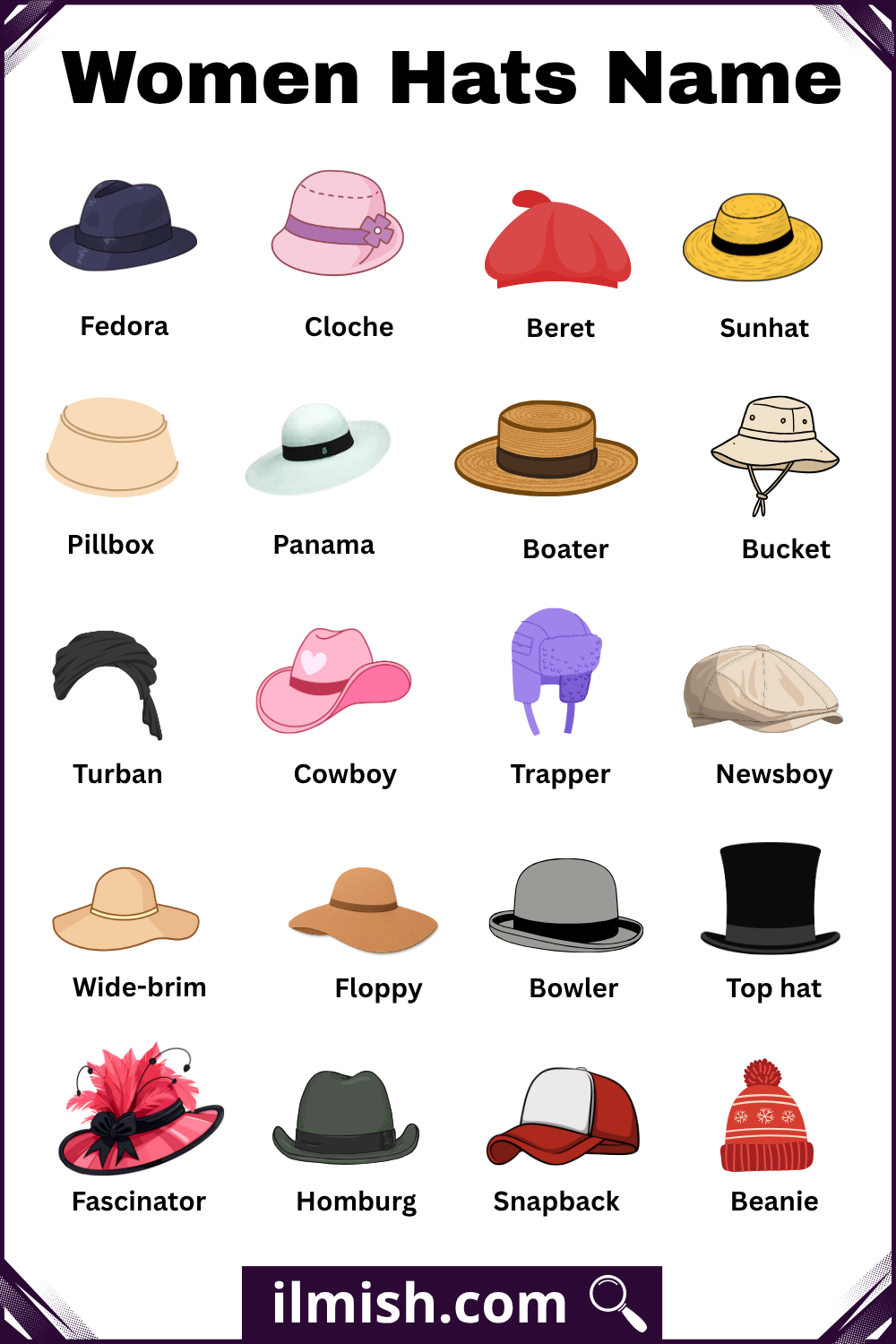 Hats have always been a stylish and practical part of women’s fashion. They add beauty to an outfit while also providing protection from the sun, wind, or cold weather. Each type of hat has its own shape, purpose, and charm, making it easy for women to match them with different looks, from casual to elegant. In this article, you will learn a List of Women Hats with Names in English and Pictures, helping you easily recognize each style and understand its use. This simple and clear guide is perfect for students, fashion lovers, and anyone who wants to improve their English vocabulary in an enjoyable way.